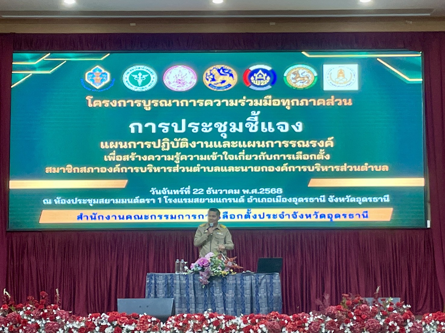 | วันจันทร์ที่ 22 ธันวาคม 2568 เวลา 9.00 น นายสาจิต จันทรศิริ ท้องถิ่นจังหวัด พร้อมด้วยท้องถิ่นอำเภอ สำนักงานส่งเสริมการปกครองท้องถิ่นอุดรธานี ร่วมประชุมสัมมนา บูรณาการความร่วมมือของทุกภาคส่วน ชี้แจงแผนการปฏิบัติงานและแผนการรณรงค์เพื่อสร้างความรู้ความเข้าใจเกี่ยวกับการเลือกตั้งสมาชิกสภาองค์การบริหารส่วนตำบลและนายกองค์การบริหารส่วนตำบล จัดโดย สำนักงานคณะกรรมการเลือกตั้งประจำจังหวัด ณ ห้องสยามมนต์ตรา 1 โรงแรมสยามแกรนด์ ต.หนองขอนกว้าง อ.เมือง และมี นายพิสิษฐ์ชัย อภัยปิยกุล รองผู้ว่าราชการจังหวัดอุดรธานี เป็นประธาน |