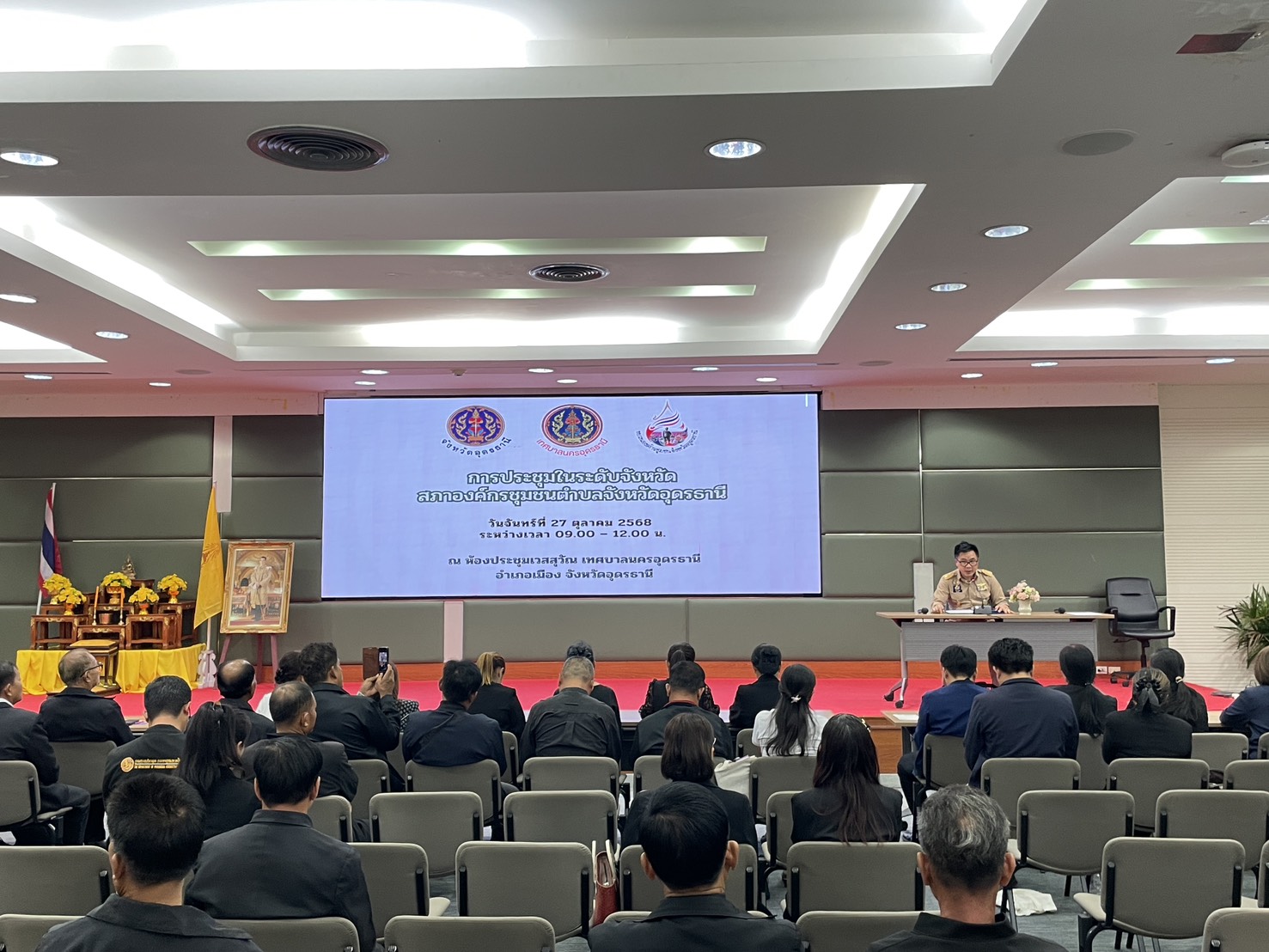 | วันจันทร์ที่ 27 ตุลาคม 2568 เวลา 10.00 น นายราชันย์ ซุ้นหั้ว ผู้ว่าราชการจังหวัดอุดรธานี มอบหมายให้ นายสาจิต จันทรศิริ ท้องถิ่นจังหวัดอุดรธานี เป็นประธานเปิดเวทีประชุมสภาองค์กรชุมชนตำบลระดับจังหวัดอุดรธานีตามพระราชบัญญัติสภาองค์กรชุมชนเพื่อเสริมสร้างความเข้มแข็งองค์กรชุมชนและเชื่อมโยงแผนพัฒนาจังหวัด ณ ห้องประชุมเวสสุวัณ ชั้น 3 เทศบาลนครอุดรธานี โดยมี ผู้ช่วยศาสตราจารย์ ดร.พิศมัย ธารเลิศ ประธานคณะทำงานขบวนองค์กรชุมชนจังหวัดอุดรธานี เป็นผู้กล่าวรายงาน |